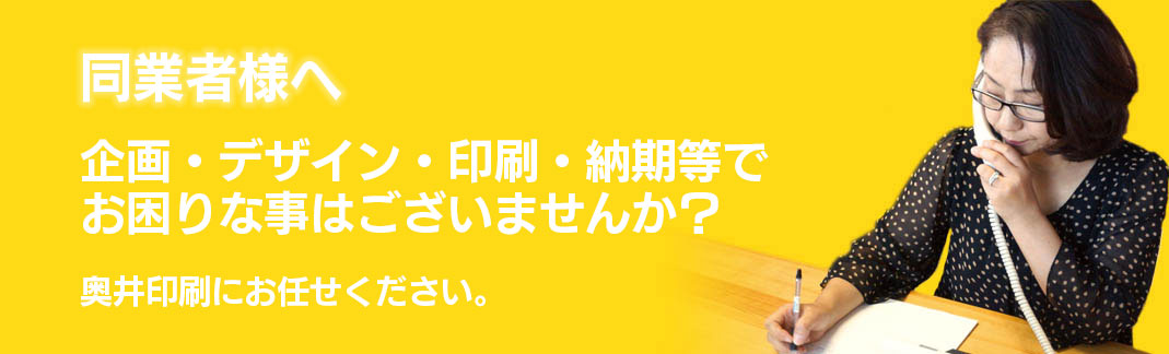 奥井印刷では常時、同業者様からのご依頼を承っております。 ご注文から印刷・製本・納品までの各工程を自社にて一貫して行うため、確かな品質・迅速な対応をさせて頂きます。納品も御社のお名前で行えます。 今後とも皆様の信頼できるパートナーであるべく経営努力を続けて参りますので、よろしくお願い申し上げます。