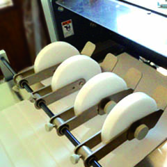 奥井印刷には消えつつある活版印刷機も配備され、鍵ミシン・Tミシンも可能です。また専用ミシン機では一度に5本が可能で効率化を計っています。凹凸のでないマイクロミシン、筋入れにも対応しています。